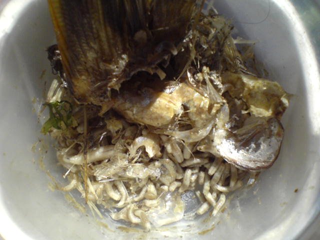 Zkoušel jsem vyrobit nějaké zařízení pro chov červů, které je na několika webech popsáno, ale nevyhovovalo mi. Pak jsem náhodou dal do starého hliníkového hrnku dvě rybí hlavy a nechal ho stát v umělohmotné krabici, co se používá na maso. Samozřejmě, že jsem na něj zapomněl a teprve po týdnu jsem jej zase objevil stát na okně v zahradě. Krabice byla plná krásných masných červů, radost pohledět. Vrtěli se okolo hrnku v šíleném maglajzu, protože hrnek byl na několika místech děravý. Důležité ale bylo, že nemohli dál. Maglajzu nebylo až tak moc a červi byli okolo stěn na suchu. Zkoušeli sice vylézt po téměř kolmé stěně krabice, ale zase padali po několika milimetrech svého výstupu zpět. Větší část se jich nahrnula do stínu hrnku a tam se zmítali jako vlna.