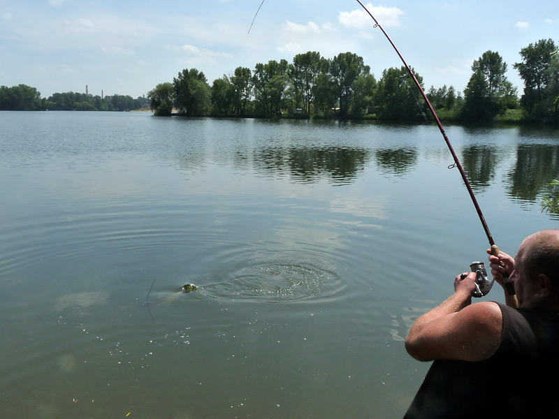 Místo je zakalené a rozplašené.Ale ve vlnkách dál od břehu vidím hřbety ryb. Jsou jich zástupy! Znovu nahazujeme oba pruty. Netrvá dlouho a je tu záběr! Přihnutá špička se jen trhnutím narovná. Takhle vždy bere amur! Tentokrát se do černého strefuje Jana. Proutek se zpočátku jen mírně přihne. První dojem připomíná tažení malého kapříka, pak ovšem do Janiných rukou udeří blesk. Sportex jí málem vyletí z ruky! Docela utažená brzda navijáku zaječí! Amur zabere mohutnou ocasní ploutví až udělá vír na hladině a vystartuje jako torpédo na volnou vodu. Žena má oči navrch hlavy. Amur si s ní dělá co chce. Neodpustím si jízlivou poznámku, že je Jana na pouštění draka již trošku velká. Po přitáhnutí brzdy a přitažení ryby ke břehu předvídám, co asi bude následovat. Stojím s podběrákem ve vodě a čekám. Amur mi v přikalené vodě „nadělí jesle“, ale nakonec ho přeci jen dostávám do podběráku. Jana září jak výherní hrací automat, na kterém se právě rozsvítí jackpot. Amur měří rovných 80 cm. Seřizuji fotoaparát a radím ženě, jak rybu správně uchopit. Rybě se v rukách moc nelíbí. Stačí pár prudkých švihů a padá do mělčiny. Je volná a my máme po fotce.