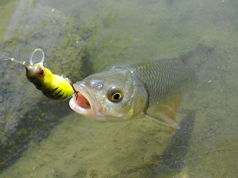 Nástrahy se snažím vodit pokaždé jinak. Někdy je stahuji po proudu při minimální rychlosti navíjení, jindy wobbler naopak táhnu energicky a přitom s ním ještě pocukávám. Výborný způsob „vedení“ nástrahy spočívá i v tom, že se nástraha nechá v klidu plout po hladině a vlasec se udržuje napnutý jen zvednutou špičkou prutu.