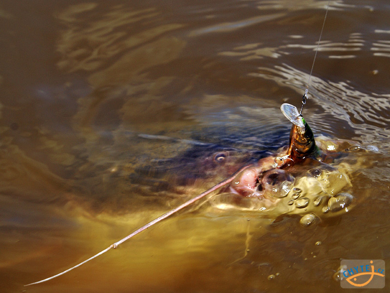 První šanci na zabodování dostanu já! V hluboké tůni pod podemletým břehem mi „okartáčovaná“ tlama nasaje nástrahu. Opřu se do prutu. Proutek propruží jako bungee-jumpingové lano, ale wobbler vzápětí vystřelí na hladinu. Po bližším prozkoumání nástrahy jsou na povrchu patrné rýhy po zubech. Kamarád vše komentuje slovy: „Kdybys měl pořádný prut a ne kravský ocas, určitě bys mu sešil pysky k sobě!“ a zálibně pohladí svou „lešenářskou trubku“.