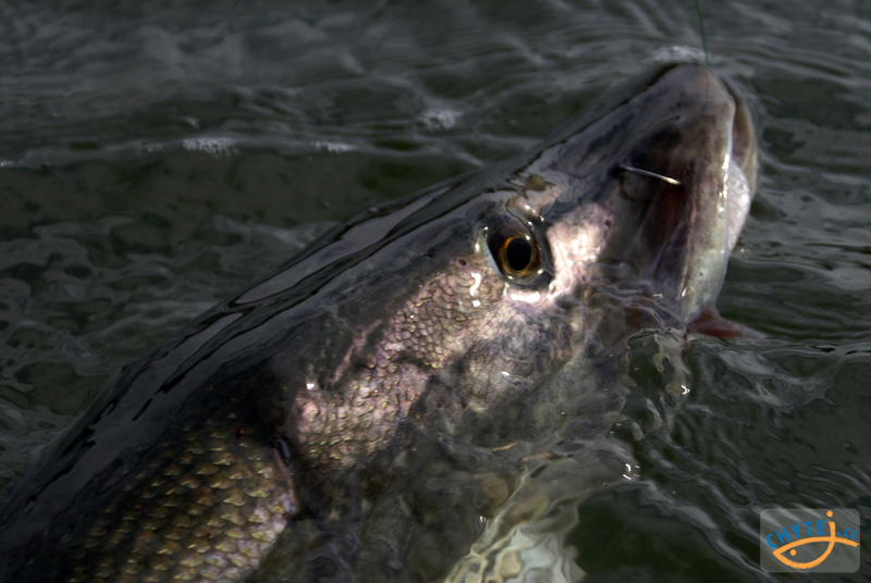 10) Díky pevnému háčku s hrotem ostrým jako jehla je tvrdá štičí tlama pevně prošitá. Dravci ke svobodě nepomůže ani série divokých výskoků nad hladinu.