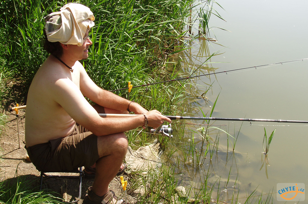 V tropickém dni je třeba se u vody chránit, mj. i rybářském kloboukem.