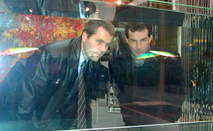 Návštěvníci pražské výstavy rybářských potřeb sledují v testovacím akváriu u stánku firmy WFS chod woblerů Dragon River. Není bez zajímavosti, že firma WFS v Praze vůbec poprvé představila své novinky pro rok 2003 – sedmicentimetrovou verzi (upravenou) známého modelu Killer a nové wobblery Bulldog v délkách 3 a 4 cm. Foto: Václav Fikar