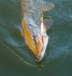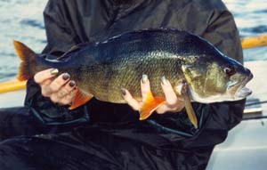 Je cca 14:00. Startujeme motor a po jeho zahřátí vyrážíme s plným plynem na ”tutová místa”. Revír, na kterém platí naše povolenka, je skutečně obrovský –Bergo + Bambole má vodní plochu s ostrůvky 8x3 km (pozn. Od roku 2003 je revír cca dvakrát větší). Cestou mi Jirka podává informace, kde je jaká hloubka, kde jsou kameny, kde minule dostali ”metrovky” atd. Přijíždíme do míst, kde budeme lov zahajovat. Kotvíme na hloubce okolo 3 m, cca 50 metrů od břehu. Ten je kompletně porostlý rákosím. Moje první volba padá na rotačku vel. 3 s hologramem v barvě perleťově modré, Jirka začíná zkoušet štěstí také s rotačkou rovněž v barvě modré. Tuto barvu volíme s ohledem na výskyt sleďů. Asi po deseti hodech hlásím nezužitkovaný zábr. Jirka vzápětí hlásí také záběr ve stejných místech. Po krátkém, o to však urputnějším boji vylovuje nádherného okouna okolo půl kila. Okamžitě nahazuji do stejných míst a rovněž vylovuji o fous většího okouna.