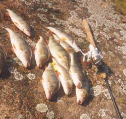 Na mně se štěstí nechce usmát, jen čistím nástrahy od vodních trav, kterých je tu opravdu mnoho a poskytují štikám dobrý úkryt. Jirka ještě během odpoledne zdolává jednu ”mírovku” (65 cm) a já nemám stále nic. ”Tak a jedeme na okouny!!!” velí okolo 18té hodiny zkušeně. Přesouváme se k jednomu z ostrovů, kde je tvrdé kamenité dno a hloubka okolo 6 metrů. Měníme štikové vláčecí pruty za jemné winkelpikry, které sice nejsou k přívlači přímo určeny, ale pro lov s jemnými twistry jsou ideální. Hned na začátku dávám za pravdu instrukcím cestovní kanceláře, že tří– až pětigramové hlavičky jsou moc lehké a zjišťuji, že těžších mám zatraceně málo. Twistrovou výbavu máme s Jirkou společnou a tak jen doufáme, že vyjdeme. Hned na druhý nához dostávám jemný záběr. Nechávám rybu ”došplhat” až k háčku a po ztěžknutí zasekávám. Dravec se urputně brání a jemounká winkelpikrová špička se ohýbá až do vody. Po chvilce vidím naježeného vzteklého okouna, jak se snaží háčku zbavit, ale nedávám mu šanci. Jemný prut a šestnácka vlasec všechny jeho výpady tlumí a po chvilce ho mám v lodi. Okoun je to opravdu slušný, má dobře přes půl kila. Po vyháčkování nahazuji do stejného místa a okamžitě zdolávám stejného dravčíka s velkýma očima a nádhernými pruhy. Dalším hodem série pokračuje.