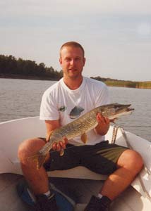 Hned první hod je úspěšný. Planda dopadá těsně vedle rákosí a po prvním otočení kličkou dostávám do prutu mohutnou ránu. ”Je tam a nebude špatná”, říkám Jirkovi. Ryba, pravděpodobně štika je velmi bojovná a vůbec se nám nechce ukázat. Objíždí loď a já mám co dělat abych jí obrátit a zabránil vjet do kotvy. To se daří. Následuje mohutný, poslední výpad štiky zakončený ukázkovým výskokem. Při něm poprvé rybu vidíme a zjišťujeme, že není nijak velká. Po chvilce ji máme u lodi, míra ukazuje rovných 80 cm. Rybu rychle fotíme´a pouštíme zpět do rodného živlu. ”No konečně jsem si taky chytl pěknou rybu” říkám Jirkovi. Následuje další nához asi o deset metrů vpravo. Hned po dopadu dostávám opět záběr, tentokrát od menší ryby. Po chvíli vylovuji další štičku okolo dvou kil. Chvíli to zde ještě zkoušíme, a Jirka ještě dostává dvě štiky okolo 60 cm. Blíží se soumrak a tak již tradičně balíme a za pomoci stáda 10 koní v našem motoru vyrážíme na okouny. Dnešní den byl na okouny nejslabším (za celý den cca 60 ks), ale se štikami to bylo lepší. Celkem jsme vylovili 13 štik, což je zatím náš denní rekord. Největší z nich má však jen těch cca 80 cm. Večer zjišťujeme, že i ostatní lodě byly dnes úspěšnjší a nejvíce bylo uloveno 16 štik na loď. Jen ty větší kusy nějak nechtějí naše nástrahy. Zatím největší štika měřila 86 cm.