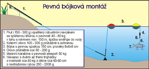 Lov na klasickou pevnou bójku, jak již bylo řečeno, patří dosud pravděpodobně k nejrozšířenějším metodám vůbec. Je to metoda relativně velmi jednoduchá, pohodlná a rovněž stále dosti účinná, a proto u ní mnoho rybářů setrvává. Princip je myslím dostatečně jasný z obrázku.