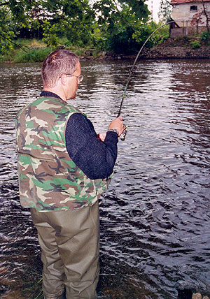 První dojmy z proutku byly příznivé. Krásné náhozy, akce taktéž, na Libře navinuta 18tka (stále jsem pavučinkám nevěřil) a netrvalo dlouho a na proutku se třepetala kudlička. Do večera jsem nechytil již nic, jen se stačil nad jezem přizabít. Když jsem se šel vykoupat, po poklesu hladiny na betonových schůdcích zůstal prima kluzký povlak a než jsem se nadál, ležel jsem ve vodě, záda naražená o schody a pata rozražená o nějaký schůdek pod vodou. Jakmile jsem se vynořil, paní poblíž mi sdělila, že před chvilkou se tam stejným způsobem rozplácl dozajista šílený vodák. Co při tom stavu vody dělal u Lužnice dodnes nevím. A prý mě chtěla varovat, ale měl jsem takový razantní nástup, že to nestihla. Z lovu nebylo nic, dokulhal jsem na pár orošených, poklábosili jsme s obsluhou o tom, jak to vypadalo při povodních, které všude okolo zanechaly pěknou spoušť a šlo se spát. Ráno jsem protáhl tělo a vyrazil k řece, dolů po proudu. Bohužel se proutek předvedl jen jednou, při zdolávání tlouštíka asi 35 cm, ale byla to nádhera. Víc se rybkám papat nechtělo.