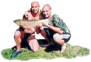 Amur se za chvilku opravdu rozjíždí směrem na vyčnívající větve. Naše strategie se osvědčuje a opět na chvíli bojuji s rybou na volné vodě. Ale znáte amury. Když ho taháte z dálky, jde jako poslušný beránek a když už si myslíte že máte vyhráno a ryba je na dosah podběráku, vystřelí jako šíp a vše se mnohokrát opakuje. Tak tomu bylo i v našem případě. Chudák David pobíhal ve vodě a v bahně ze strany na stranu a stále odvracel amura od jeho jistého uváznutí. Byli jsme všichni tři úplně vyčerpaní, a tak se nám po půlhodině vzdal i "pan" amur. Podebíráme ho a s radostí se chystáme na břeh. Ale ouha! Přes všechny ty větve a stromy se nemáme šanci dostat z vody. Davča si tedy dává podběrák s vyčerpanou rybou přes rameno, já tak činím s prutem a plaveme k druhému prostupnějšímu břehu. Asi nádherný pohled na dva mokré blázny. Na břehu na nás čekají ostatní členové naší party a mluvíme jeden přes druhého o nezapomenutelném zážitku. Stříbrnou až tmavě zlatavou překrásnou rybu pokládáme na podložku a nastává nezbytné focení. Amur má po zvážení krásných 7 kg. Vzhledem k použitému náčiní a podmínkám zdolání je to pro nás opravdu vymodlený úspěch.
