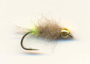 ![]() | Zlatohlavá nymfa I Háček: č. 8 – 14, mokrý Štěty: špetka paprsků z prsního pírka divokého kačera nebo koroptve Koneček: fluo žlutý Spectra Dubbing Tílko: středně hnědá srst vačice dabovaná do smyčky Hlavička: zlatý korálek |