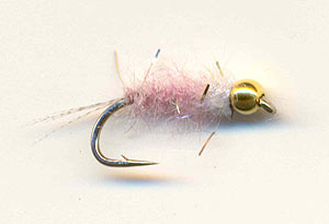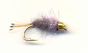 ![]() | Zlatohlavá nymfa III Háček: jako předchozí Štěty: špetka paprsků z prsního pírka divokého kačera Tílko: růžová střiž s příměsí nastříhaných stříbrných lametek Hruď: bílý Spectra Dubbing s fialovým leskem Hlavička: jako předchozí |