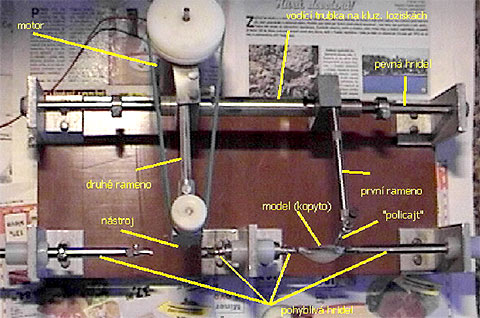 Po poradě s jedním mechanikem vznikl nápad. Mnohým bude princip známý– jedná se vlastně o kopírovací stroj, kde jsou, jak je vidět z obrázku, dvě ramena a dvě sklíčidla, dá–li se to tak vůbec nazvat. V jednom ze sklíčidel je umístněn model (kopyto) – odlitek původního woblerku.