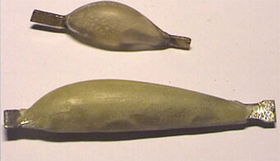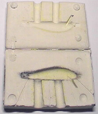 Postup: odstrojíme původní wobler, namícháme hustou sádru, celý woblerek namažeme indulonou, následně zatlačíme wobler do sádry (pouze do poloviny). Po vytvrdnutí sádry její povrch namažeme indulonou a zalijeme sádrou. Pak jen stačí po vytvrdnutí vše oddlit a vyjmout původní woblerek (nemusíte mít strach, zůstane nepoškozen). Šroubovákem udláme do formy otvory pro nalití dentakrylu (či nčeho podobného) a otvory pro odvod vzduchu. Celou formu před nalitím opt vymažeme indulonou. Pro následné uchycení kopyta vložíme kousek plíšku.