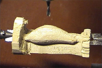 Ve druhém ramenu je pak obrobek – kus dřeva. První rameno prostřednictvím šroubu, čepu či jakéhosi „policajta” opisuje tvar modelu. Tento pohyb je přenášen na rameno druhé, které je osazeno frézou. Postupným frézování a otáčení modelu a obrobku (vše se otáčí současně), je docíleno celkem věrné kopie. Jak prosté :–). Kdyby se snad někdo chtěl pustit do výroby takového zařízení, tak jen jedno upozornní (mechanické provedení nechám na vás), fréza by se mla točit alespo 10 000 ot/min. Je to důležité, protože balza i lípa se "ráda" štípe. Nutno podotknout, že jsem celé zařízení nestavěl sám, ale nechal jsem si ho udělat od dědy mé přítelkyně p. Hamala (bývalý kostruktér F3).