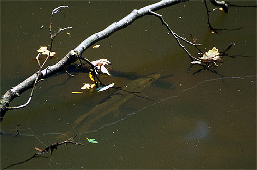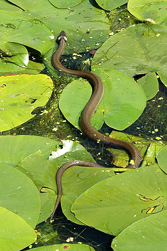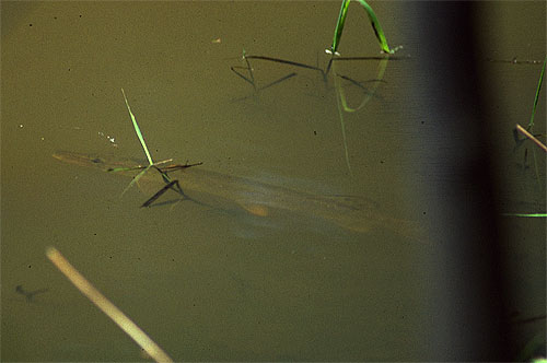 „Tak už pojď, jsi skoro hodinu pryč a slíbil jsi, že nebudeš chytat“, zní odpověď. „Ještě, zkusím vyfotit nějakou jinou a běžím“, odpovídám. Nechápu, proč se neraduje se mnou a prodírám se dál křovím kolem vody. Jsem asi deset metrů od vody a vidím u leknínů, asi dva metry od břehu, stát štíhle. Pomalu se plížím, krok po kroku. Žbluňk. Přímo u břehu stála slušná štika. Žbluňk, žbluňk, žbluňk... Další dvě stály vlevo a i ta od leknínů je pryč. „Sakra, to přeci není možný“, kleju. Slušně maskován špínou a bahnem, pavučinami ve vlasech a s pocitem napětí vojáka ve Vietnamu se plížím kolem břehu dál a nedbám toho, že mi naskakují pupínky od kopřiv, že mám obličej od prodírání se křovím celý podrápaný. Scénář se však opakuje. Štik je tu spousta, ale vždy, když už stavím stativ a chci fotit, tak mě většinou zaregistrují a unikají. Sem tam se mi nějakou podaří vyfotografovat. Dokonce objevuji i zlatého jesena ve společnosti asi tří tloušťů a bez problémů je zvěčňuji. Objektiv fotoaparátu samozřejmně nepohrdne ani karáskem, žábou, vážkou či dokonce užovkou.