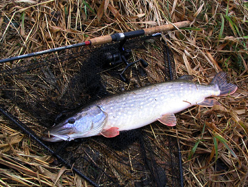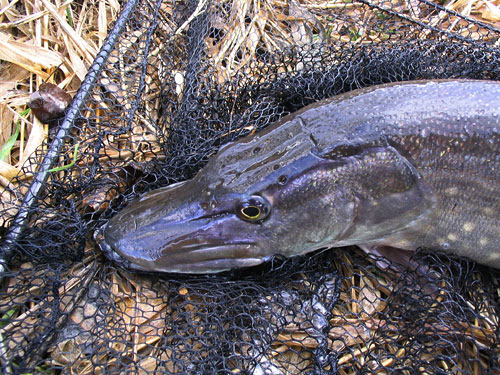 Než si to mozek přemele, ruce vypnou vlasec a zaseknou. Tvrdě, jako do pařezu. A to něco se dává do pohybu s důstojnou a neúprosnou pomalostí velkých ryb. Prut se plynule ohne, cívka navijáku roztočí a štika se valí napříč řekou. Když dorazí ke druhému břehu, chvíli se obrací na místě, voda se doslova vaří a pak jízda pokračuje. Žádné skoky, obraty, pořád jen stálý přímočarý tah. Ale tohle žádná štika dlouho nevydrží. Nechávám ji jezdit a při každé příležitosti namotám zpátky kousek vlasce. Vypadá to dobře. Při jedné z dalších přímočarých jízd rozbalím podběrák. Nosím pořádný, teď se bude zas jednou hodit. Podebrání je nakonec jediný kritický moment celého zdolávání. Ryba se podběráku bojí , válí se a kroutí, aby se mu vyhnula a tak nakonec děláme unavovací kolečko, po kterém už ji navedu nad potopenou síť bez problémů. Zvedám úlovek a vynáším ho na břeh. Štika je menší než byl první dojem, naměřím 83 cm a hmotnost odhaduji těsně přes 4 kg, což se doma potvrdí. V očích mi hoří plamínky loveckých pudů vybičovaných nervydrásajícím odpolednem. Osud úlovku je zpečetěn, ale zároveň si slavnostně slibuji, že ostatní zubatice na objeveném fleku se sice pokusím pochytat, ale smutného konce jejich kolegyně je ušetřím.