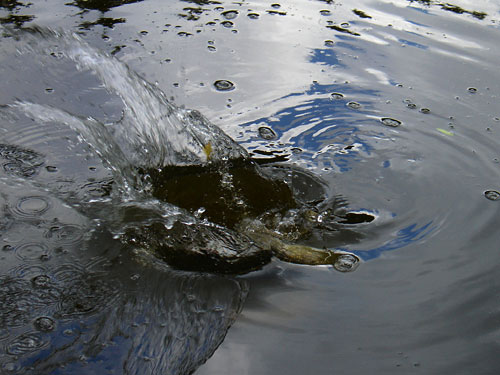 Nechal jsem všeho a v momentě se přesunul na místo, odkud se dalo nenápadně nahlédnout do hnědavé hlubiny. Samozřejmě jsem neviděl nic, co by stálo za řeč, ale jemné ťupání po hladině a pár mihnutí svědčilo o tom, že zrovna tady se z nějakého důvodu nahromadilo hejno potěru, o které se kromě mě zajímá i někdo jiný. Svědčil o tom i náhlý nepokoj mezi rybkami pár metrů směrem po proudu. Houpnul jsem ripperem, aby měkce dopadl kousek za inkriminované místo, nechal ho propadnout ke dnu a uvedl do pohybu. Neutáhl jsem ho ani metr a měkoučkou špicí prutu mi zacloumal záběr.Reflexivně jsem zasekl a vodou projelo tělo štiky evidentně přes šedesát centimetrů, prorazilo hladinu a v divokém obratu se vrhlo ke dnu. Setrvačností vytáhlo z navijáku pár metrů osmnáctky, znovu obrátilo, opsalo kruh a zamířilo zpátky k hladině.