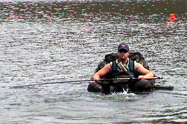 Po vyplutí na přehradu, vyzbrojen množstvím teorie a prutem, na jehož konci je halibutový háček, takzvaný "sirklhůk" (circlehook), začínám vábit. Abych pravdu řekl, není to úplně snadné. Člověk sedí podstatně blíže k vodě, než když je v lodi. Nakonec si ale zvykám a na echolotu, který mám v klíně (sondu připevněnou na plováku tahám za sebou jak kačera), sleduji první reakce. Zatím nejsou nikterak slavné, ale jsou. BUM!!! Rána do prutu. A dál nic. Krve by se ve mě v tu chvíli nedořezal. Zapaluji si cígo a pokračuji. BUM! Instrukce jsou jasné: musím povolit a nechat sumce zažrat a pak tahem zaseknout. Sumec však nástrahu pouští. Celé se to opakuje ještě dvakrát, ale žádného nezasekávám. Začíná se zvedat vítr. Raději se vracím na břeh. Teprve tam mi dochází, že jsem vlastně rád, že jsem žádného sumce nezasekl. Už takhle to bylo adrenalinu až nad hlavu. Ještě se nechat tahat po Ebru a bát se jak to dopadne. "Tůdle nůdle! Už na to nevlezu!", vzkazuji místním sumcům. Až doma se od Pavla dozvím, že jsem měl chybně sestavenou montáž, tj. že jsem vynechal nutný splávek, díky kterému může sumec nástrahu pozřít. To mi jaksi při teoretické přípravě Pavel zapomněl sdělit :-) (Jen počkej, já Ti to vrátím :-)). Je to fakt, tuhý sumcový prut moc citu do ruky nedává a ve vratkém bellyboatu už vůbec ne.
