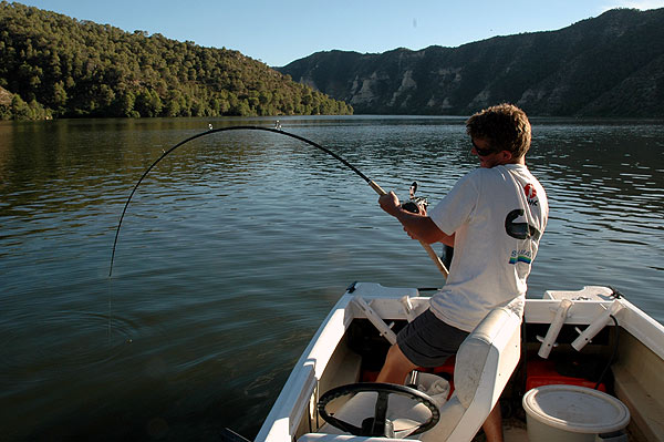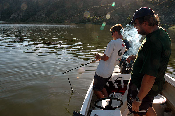 Poté co nadšeně klukům vyprávím o slušných reakcích sumců na vábničku se domlouváme, že na ně vyrazíme s velkou lodí. Ondra ještě nikdy sumce na vábničku nechytl a tak je na to pěkně natěšen. Jenže sumci jakoby snad věděli, že z velké lodi jsou šance na vítězství spíše na naší straně, a nereagují. Anebo hodně vlažně. Na třetí vyjížďce s vábničkou jsme již méně ostražití, nicméně vím, jak rychle se může situace změnit. Proto máme s Láďou pruty stále pod kontrolou. Jen Ondra je v klidu. Opřen zády o bort lodi, prut položen a "dlouhej kouř a pohoda jazz". Ačkoli mu s Láďou stále říkáme, že má prut alespoň držet, nevyvádí ho to z klidu a opřen pozorujíc místo prutu echolot kouří jednu "marlborku" za druhou. "U dna se zvedla pěkná ryba", hlásí Láďa a jde jí s nástrahou naproti. "Je ve 14 metrech", hlásí dál. Sumec se chvíli ukazuje a mizí. Ondra, který měl nástrahu v osmi metrech najednou vyhrkne: "Je tam!" Jen tak tak drží prut, který se ohýbá až pod loď. Div, že ho stihl chytit. "Utáhni mi brzdu!", houkne na Láďu a křečovitě svírá oběma rukama prut. Zapomněl si ji totiž zřejmě nastavit a nyní potřebuje obě ruce na zdolávání. Snaží se sumce zvednout k hladině. Ten však nechce. Beru do ruky foťák a zdolávání si fotím. Ondra mi pěkně pózuje a do sumce se opírá co to jde. V jednu chvíli si říkám, že ten prut to nemůže vydržet. Při zdolávání z lodi je totiž důležité při silném tahu nejít s prutem příliš nahoru.