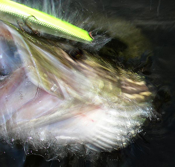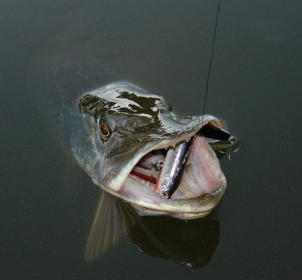 Famózní situaci jsem řešil v okamžiku, kdy jsem se pokoušel vyfotit tlamu bezmála třičtvrtěmetrové ryby svírající čtrnácticentimetrového Husky Jerka, zatímco mezi impozantními zuby protékaly pramínky vody. Soustředěn na panel přístroje jsem přehlédl, že se zelený válec přede mnou roluje do předpisového „účka" a když hlava ryby tlačící vlnu tříště vyrazila vpřed, nacházel se fotoaparát nějakého čtvrt metru před ní. Spíš z leknutí než z čeho jiného jsem stačil zmáčknout spoušť a uhnout čelistem prolétajícím místy, kde se ještě před chvílí leskla čočka mého objektivu. Ten den jsem dofotil, ale vzniklý záběr je přes technickou nedokonalost poměrně zajímavý - ostatně to můžete posoudit.