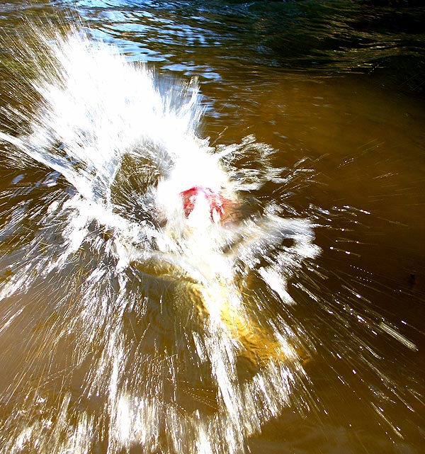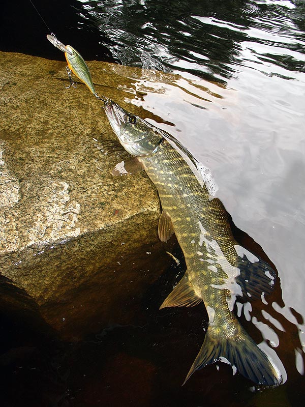O něco vážnější situaci jsem zažil při fotografování nevelké štiky v zajímavém podvečerním osvětlení. Zabrodil jsem lehce na kolena, abych využil nažloutlé ploché světlo a pohrál si s odrazy na vodní hladině. Skutečně jsem udělal pár fotek a shledal je nevalnými. To, co se tak líbilo mým očím, nedokázala technika uspokojivě zachytit. Znechuceně jsem vypnul foťák, nechal ho viset na krku a sehnul se ke štičce, abych ji odháčkoval. Ta se mi ale vysmekla a vyrazila na volnou vodu. Lovecký instinkt byl silnější než zdravý rozum, takže jsem se hbitě natáhl, popadl rybu v týle, ale současně si uvědomil, že koupu fotoaparát v řece. Následovalo bleskové narovnání, vyjmutí baterek a standardní vysoušecí procedura, po jejímž absolvování foťák... naběhl jako zatím vždycky.
