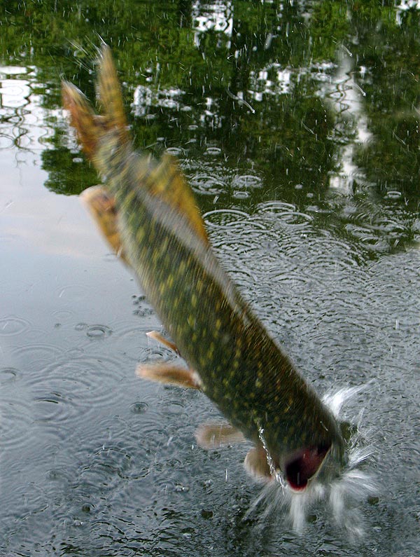 Z těch, které máte možnost vidět, mě trochu mrzí obrázek, na němž rozmazaná štika předvádí stojku. Tenkrát jsem bohužel stál až příliš blízko. Spoušť jsem zmačkl, když zdolávaná pětašedesátka nasazovala ke skoku a expozice proběhla přesně uprostřed bleskového salta, jehož průběh mé oči prakticky nedokázaly sledovat. Ruka už v té chvíli uhýbala z cesty letící rybě a to, co je vidět na snímku, není žádný výřez. Štika vyplňuje celou plochu snímače, přestože objektiv je nastaven na nejkratší ohniskovou vzdálenost. Stát o kousek dál, byla by to možná podstatně lepší fotka.