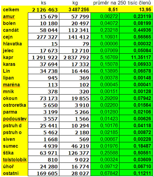 Několikrát jsem byl na výborové schůzi naší MO (Tábor) a ptal jsem se, kolik je +/- nachytáno na jednu povolenku v průměru. Připadalo mi to, jako bych chtěl po jednateli, aby dělal kliky na řasách. Tak jsem se pokusil spočítat to sám, za pomoci dostupných informací. Statistika sumářů ČRS je veřejně k nahlédnutí na Svazových stránkách. Počet prodaných povolenek můžeme jen odhadovat, údaj zveřejněn není. Celkově se „pyšníme", že jsme asi 360-ti tisícovou zájmovou skupinou v celé republice. Kdyžto odečteme MRS, tak se dostaneme na číslo okolo 250-260 tisíc členů. Jistě někdo namítne, že si kupuje pouze P povolenku, ale zase tu nejsou promítnuty hostovačky nečlenů ČRS, čímž jsou většinou cizinci. Nechme tedy číslo na 250 tisících, ať se nám to dobře počítá.