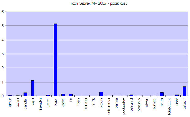 Každý jsme si odnesli od vody za rok 2006 v průměru osm a půl ryby o váze skoro čtrnáct kilogramů, což je vlastně dvoudenní povolený hmotnostní limit. Nejvíce diskutovanou, chválenou, vyhledávanou i zatracovanou rybou je pochopitelně kapr. Toho máme každý ve vezírku 5,2 kusu, 11,4 kilogramu. Na kusy je to třídenní limit. Průměrně ponechaný kapřík měl 2,2 kila, což je tak něco okolo 45 centimetrů. Druhým v pořadí je cejn, kterého jsme si ponechali jednoho celého a jednu desetinku o průměrné hmotnosti 0,56 kg.