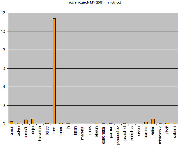 Každý jsme si odnesli od vody za rok 2006 v průměru osm a půl ryby o váze skoro čtrnáct kilogramů, což je vlastně dvoudenní povolený hmotnostní limit. Nejvíce diskutovanou, chválenou, vyhledávanou i zatracovanou rybou je pochopitelně kapr. Toho máme každý ve vezírku 5,2 kusu, 11,4 kilogramu. Na kusy je to třídenní limit. Průměrně ponechaný kapřík měl 2,2 kila, což je tak něco okolo 45 centimetrů. Druhým v pořadí je cejn, kterého jsme si ponechali jednoho celého a jednu desetinku o průměrné hmotnosti 0,56 kg.