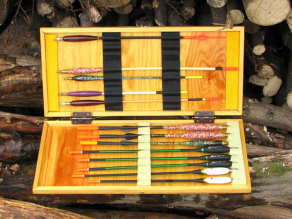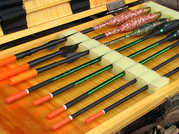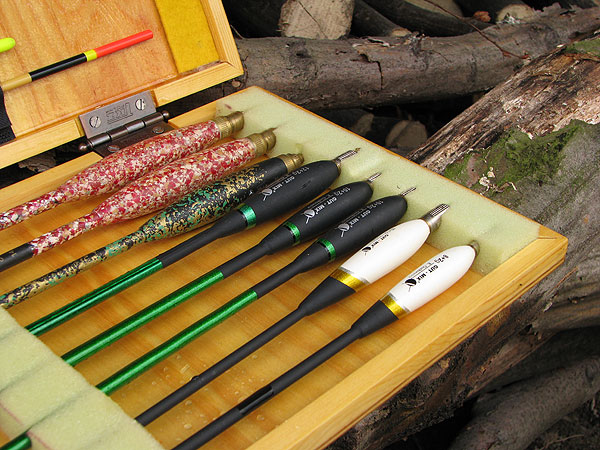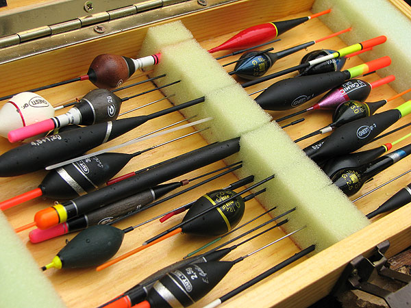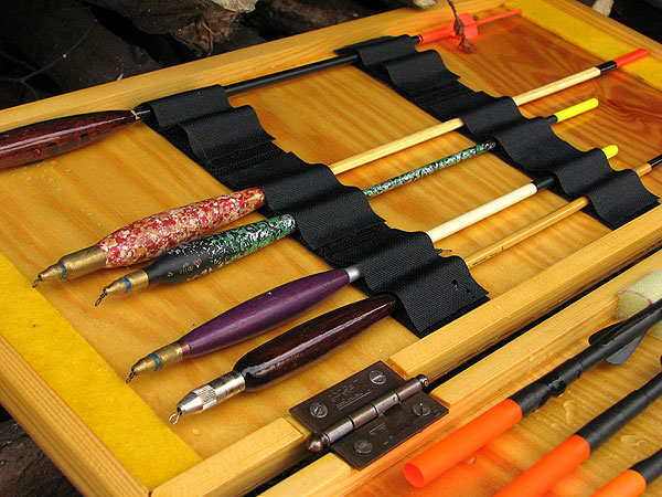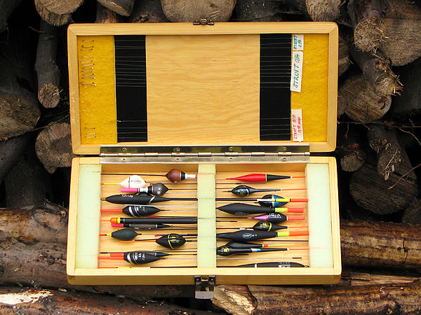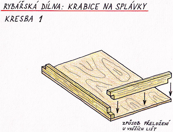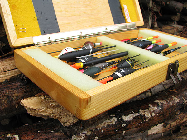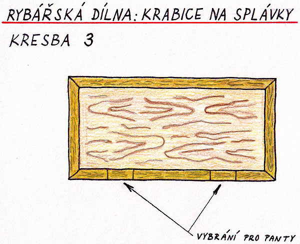 O tom, jak budete splávky do krabičky ukládat jsme museli přemýšlet už při návrhu rozměrů krabičky. Z molitanu si nařežeme ostrým nožem pruhy v odpovídajících rozměrech. Do krabičky je vlepíme pomocí oboustranné lepící pásky (bude je možno vyměňovat) nebo běžným lepidlem (to bude napevno). V příslušných místech vyřežeme do molitanu zářezy pro uchycení našich splávků. Možností uchycení je ale více .... Např. pomocí suchých zipů, návazce můžeme zase napíchat do pruhu plsti apod. (viz fotografie).