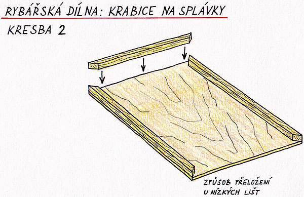 Lepidlo naneseme jak na lištu, tak na překližku, necháme chvíli odvětrat a poté lištu silou přitiskneme k překližce. Hrany lišt musí samozřejmě lícovat s hranami překližky. Přilepené lišty zajistíme buď pomocí stolařských svěrek nebo alespoň pořádně zatížíme na minimálně dvou, lépe ale na třech místech a necháme schnout. Po zaschnutí máme v ruce polotovar, na který je třeba dolepit dvě zbývající strany (viz obr. 2).
